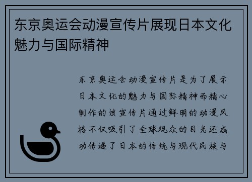 东京奥运会动漫宣传片是为了展示日本文化的魅力与国际精神而精心制作的。该宣传片通过鲜明的动漫风格,不仅吸引了全球观众的目光,还成功传递了日本的传统与现代、民族与国际化之间的和谐融合。本文将从多个角度分析...