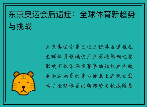 东京奥运会虽已过去,但其后遗症在全球体育领域仍产生深远影响。这些影响不仅体现在赛事的组织、经济效益和运动员的身心健康上,还深刻影响了全球体育的新趋势与挑战。随着疫情带来的不确定性,东京奥运会的后遗症成...